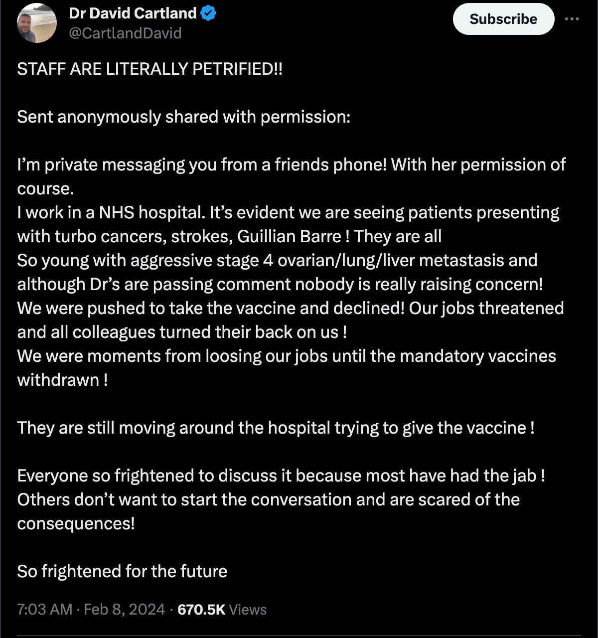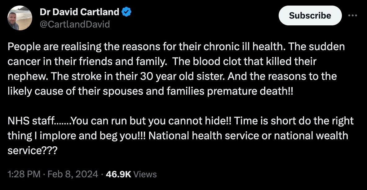 And now an NHS hospital whistleblower has come out with a terrifying account of all of the death and destruction they are witnessing not from any Gain of Function “pandemic,” but, rather, from the actual depopulation payload in the associated DEATHVAX™; to wit: