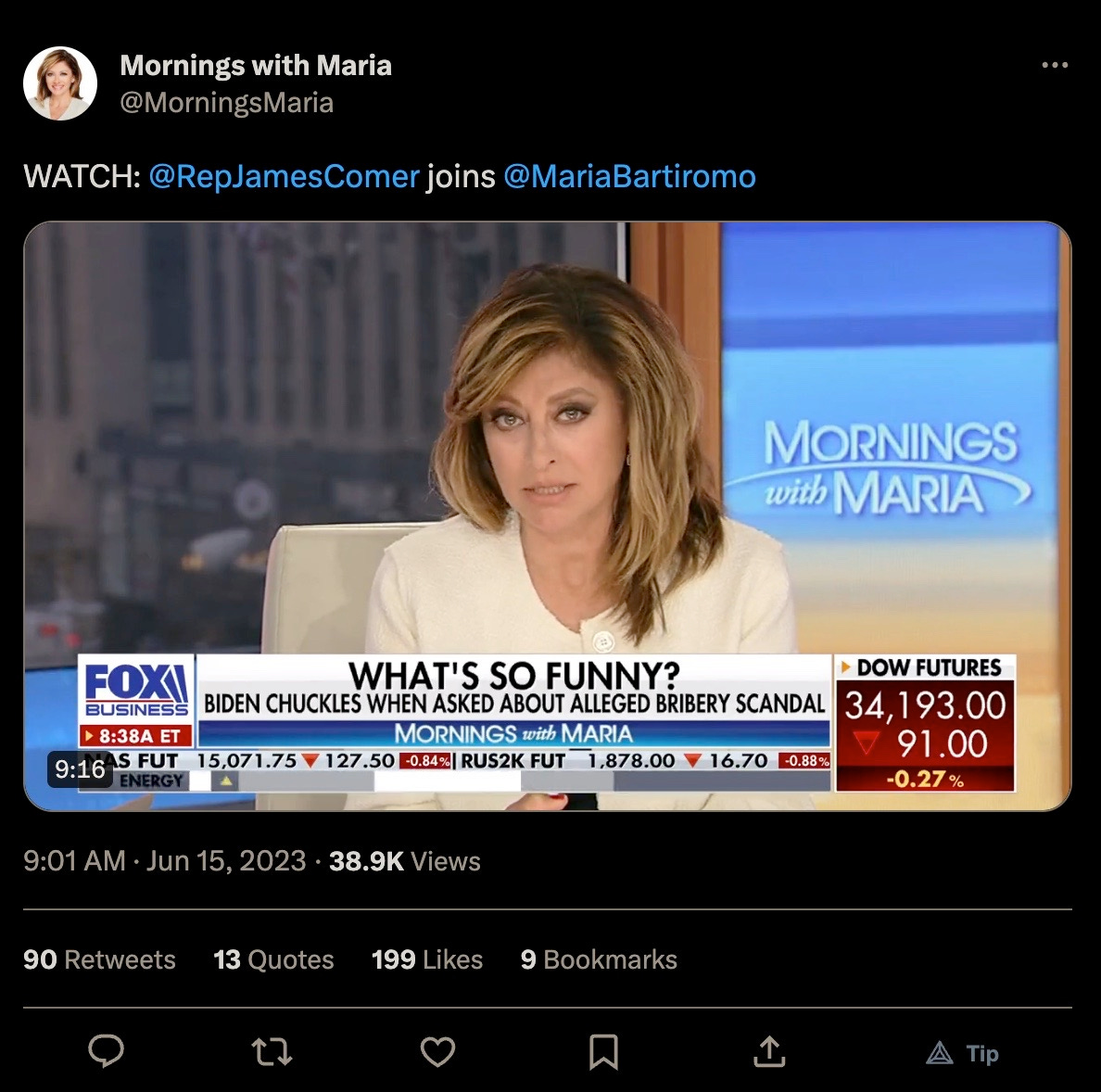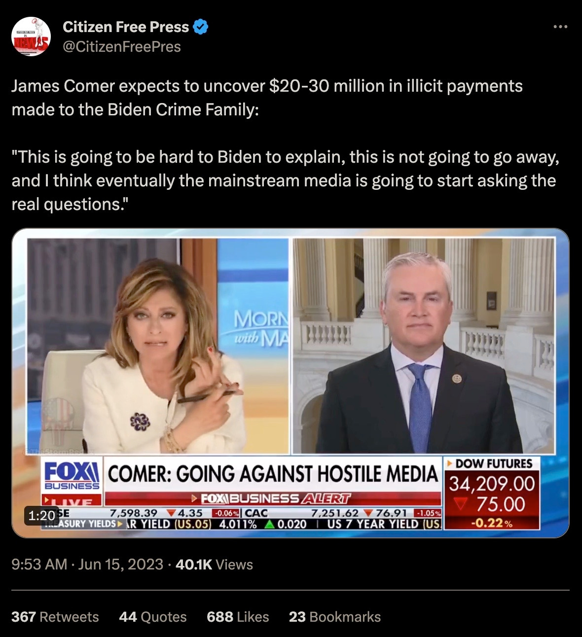 Appearing on Fox Business, Comer stated “We have more bank records coming in but we’re gonna exceed $10 million this week but I think we’ll get up to $20-$30 million.”