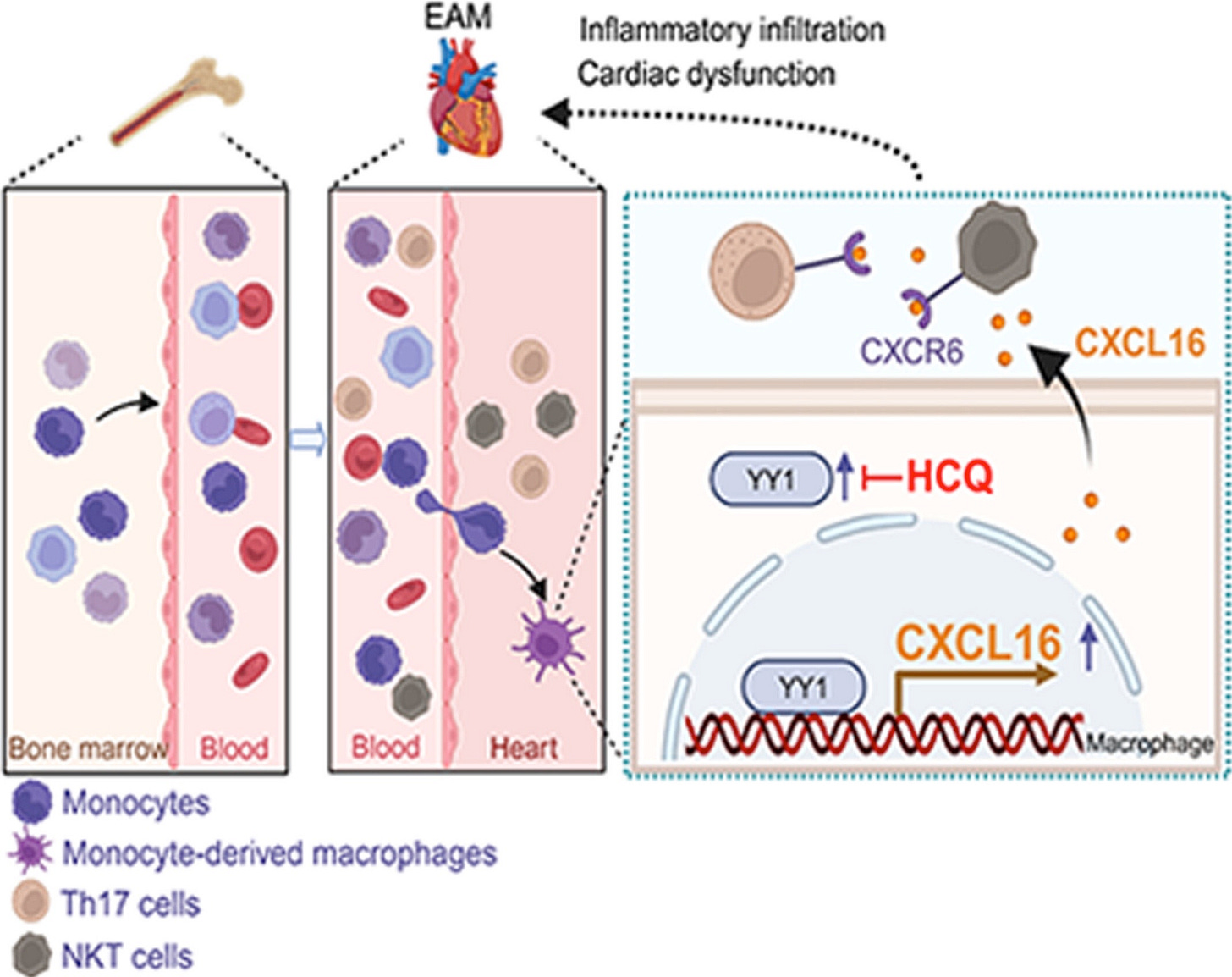 HCQ improves cardiac function and reduces inflammation in myocarditis by inhibiting CXCL16 expression in macrophages, by suppressing its transcription factor YY1, which in turn reduced the chemotaxis of Th17 and NKT cells. HCQ is a promising therapeutic agent for myocarditis.