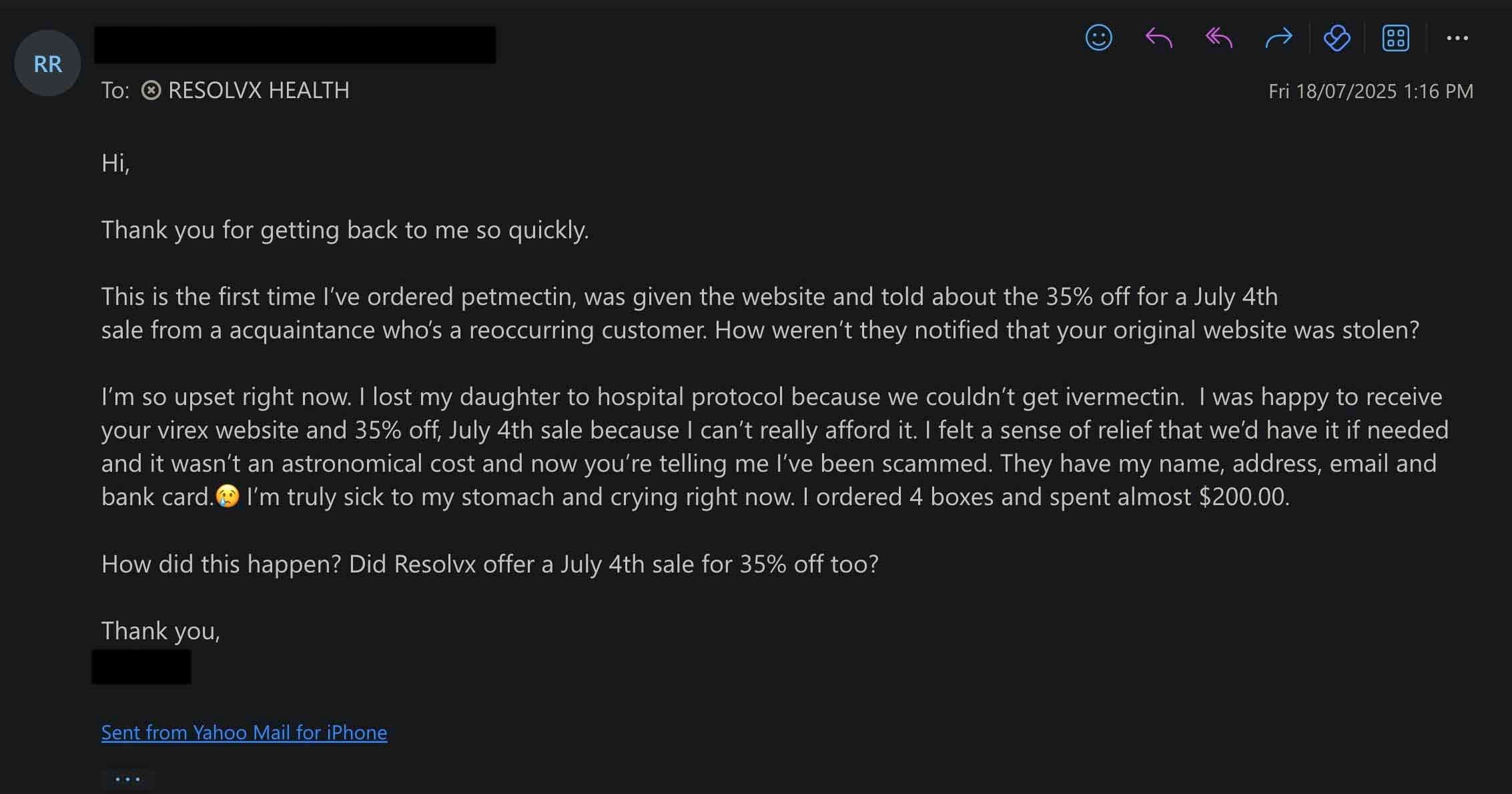 The owner of RESOLVX HEALTH — who still remains legal owner of the virex website that is currently operating without his authorization — has sent this Substack a series of incredibly damning emails corroborating that this sociopathic husband and wife team have now completely stopped shipping their fake product, which has left many very confused and worried customers reaching out to RESOLVX HEALTH; for example: