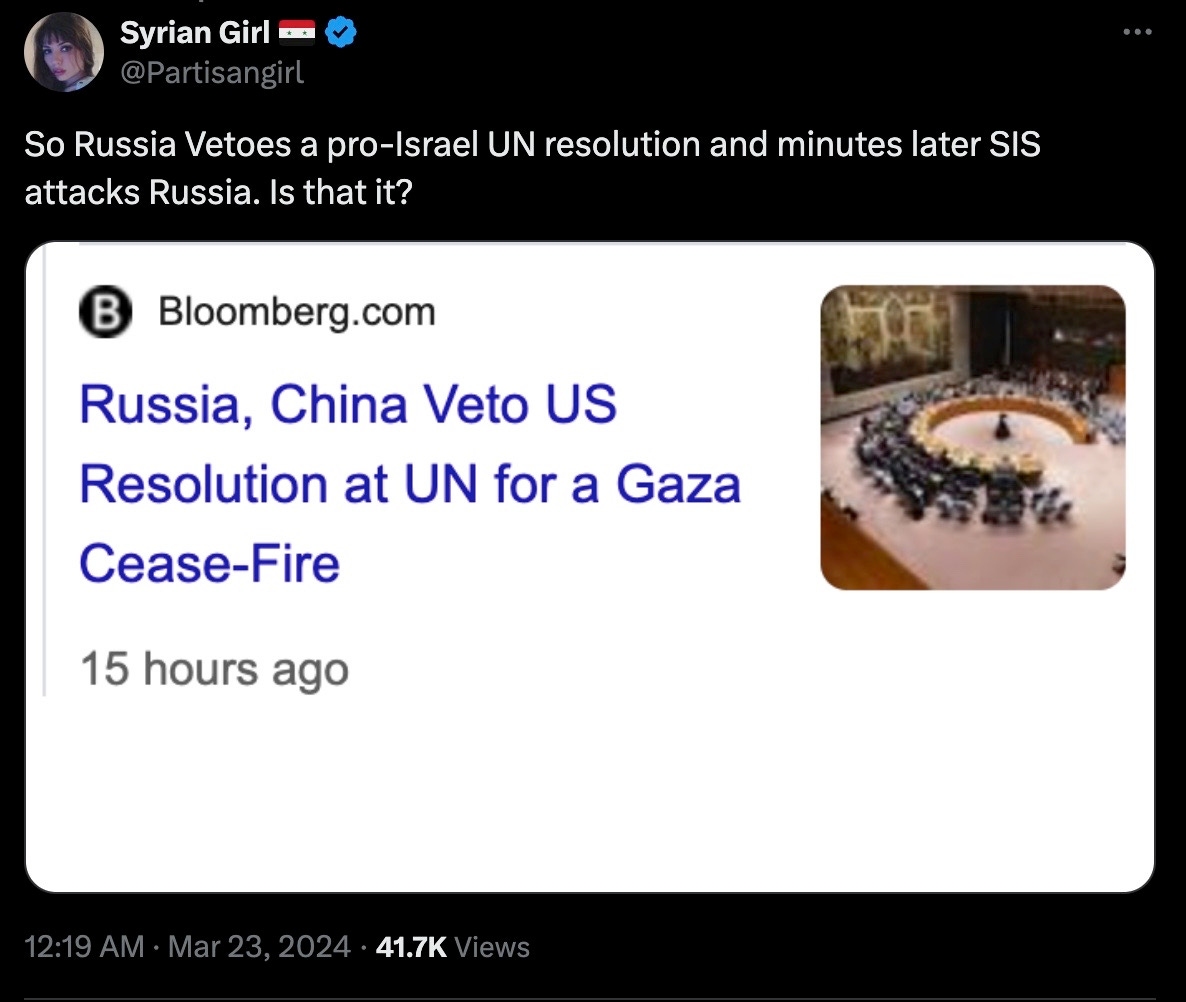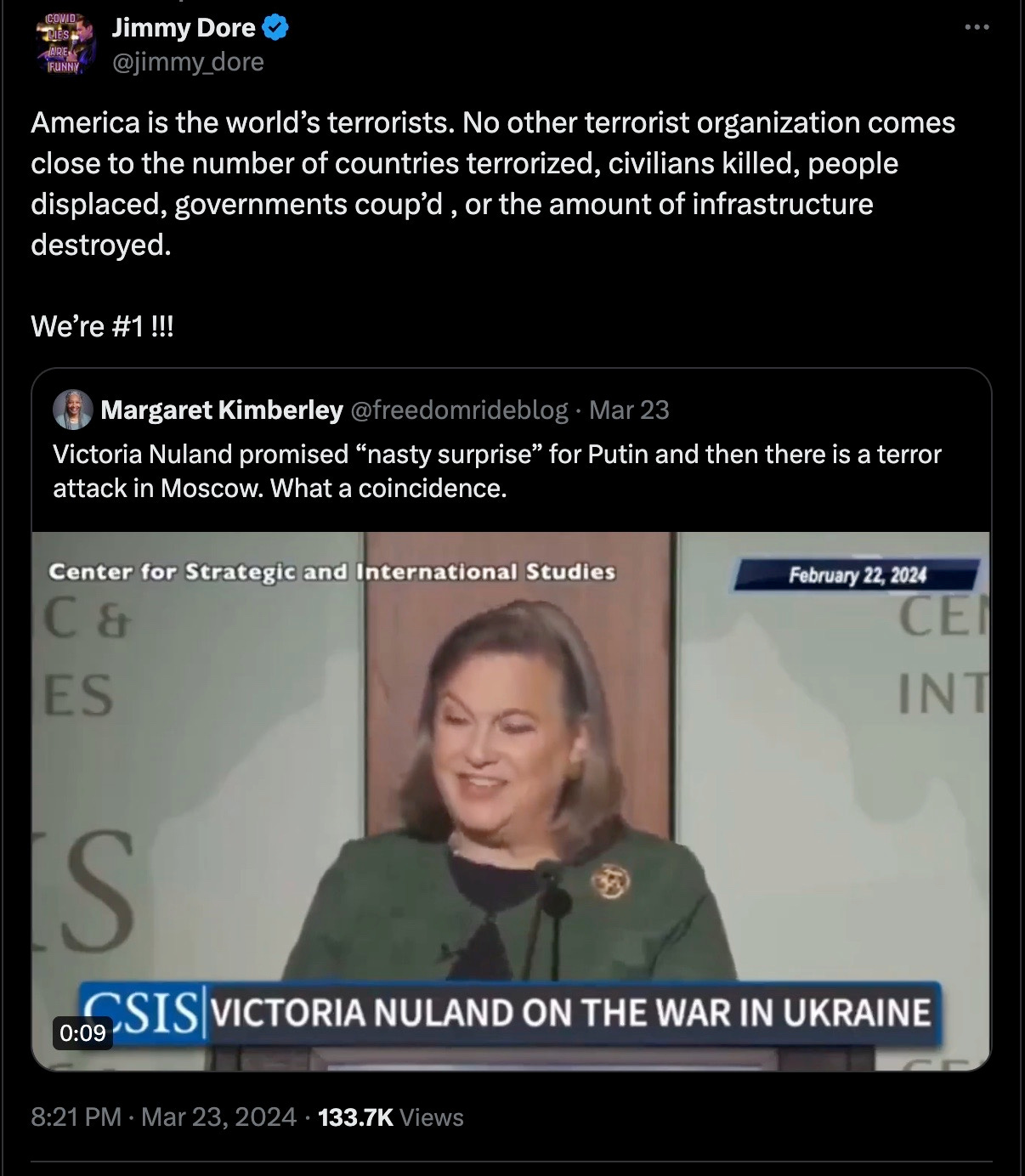The timing of the Crocus massacre is quite intriguing. On a Friday during Ramadan. Real Muslims would not even think about perpetrating a mass murder of unarmed civilians under such a holy occasion. Compare it with the ISIS card being frantically branded by the usual suspects.