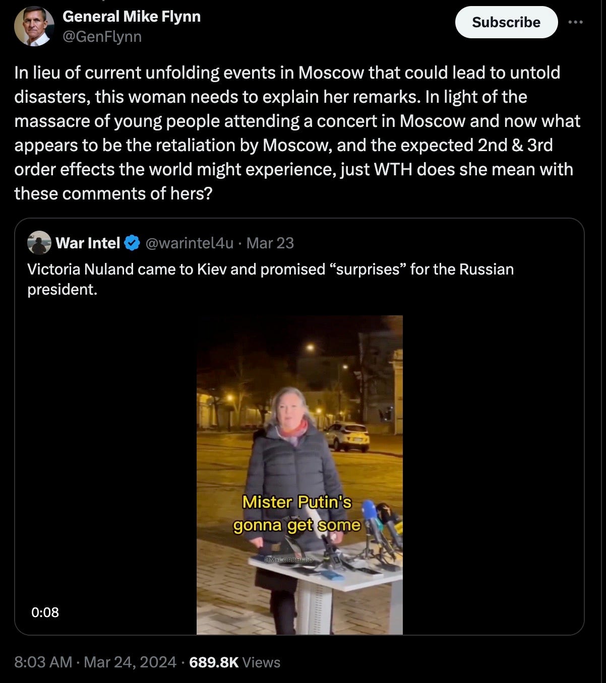 In a nutshell: now war has morphed from Donetsk, Avdeyevka and Belgorod to Moscow. Further on down the road, it may not just stop in Kiev. It may only stop in Lviv. Mr. 87%, enjoying massive national near-unanimity, now has the mandate to go all the way. Especially after Crocus.