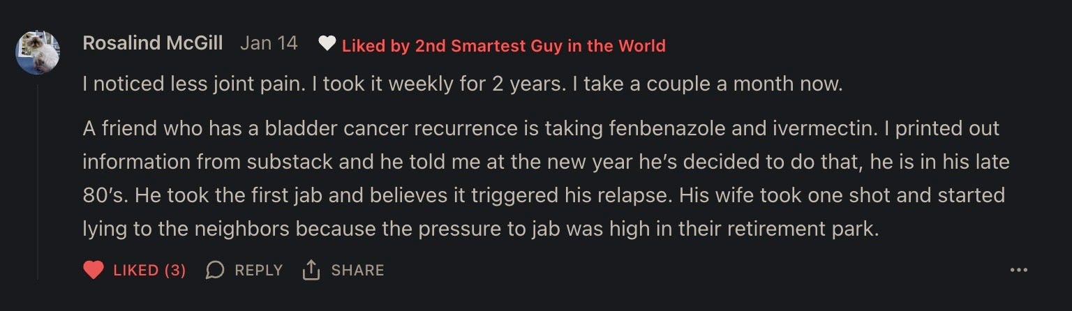 This Substack has recently written about the wonder drugs Ivermectin and Fenbendazole: As a combination therapy these two drugs offer a highly synergistic approach to curing a wide range of ailments from slow kill bioweapon injection damage to prion-based diseases to (turbo) cancers, etc.