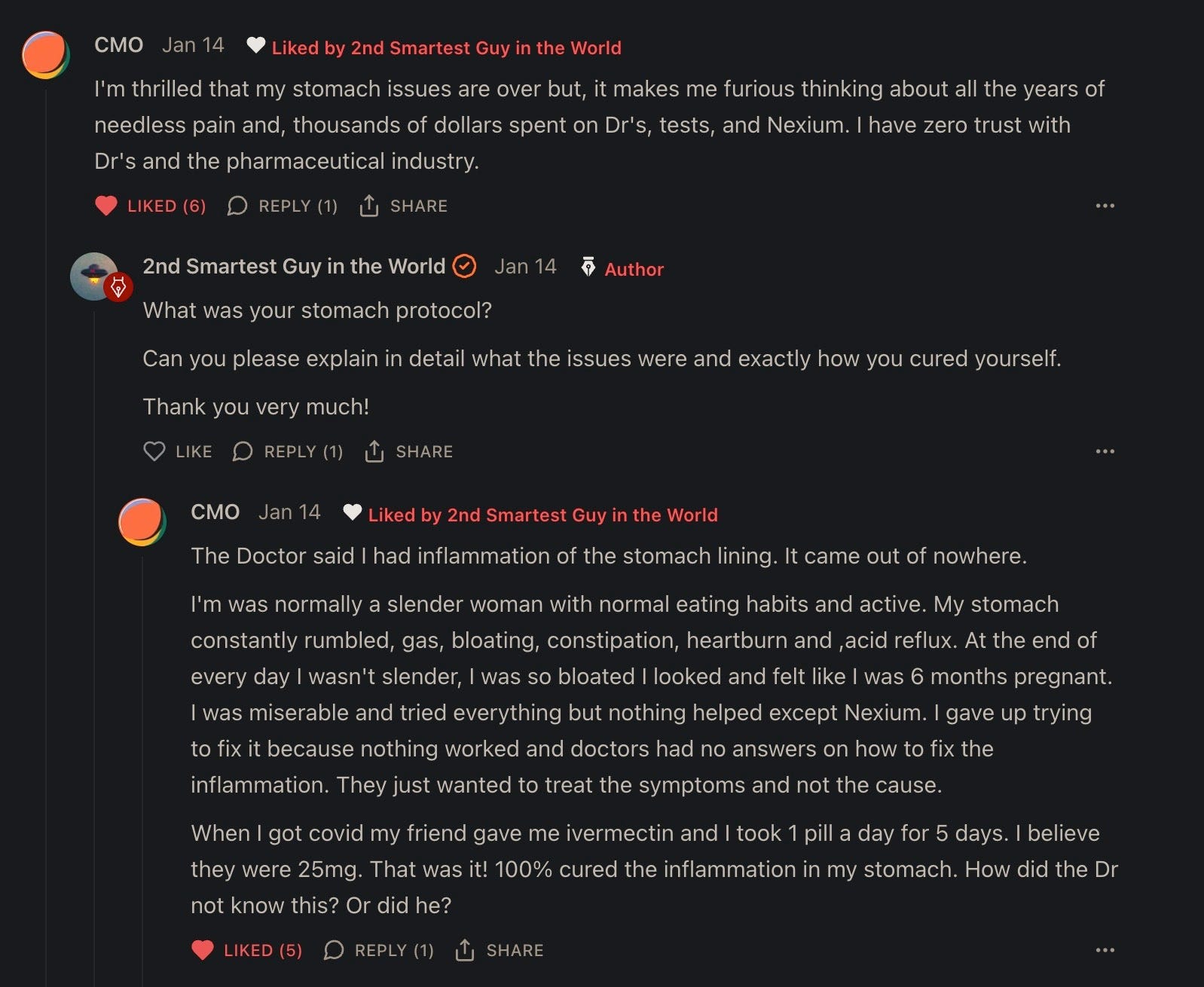 The third anecdote about a five-day course of ivermectin curing longstanding gastric issues (not the reason she took the ivermectin, but a totally unexpected side benefit -- clearly not a placebo effect), reminds me of my own experience about 30 years ago....