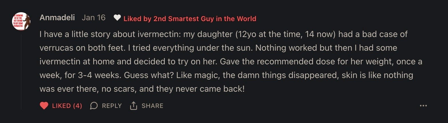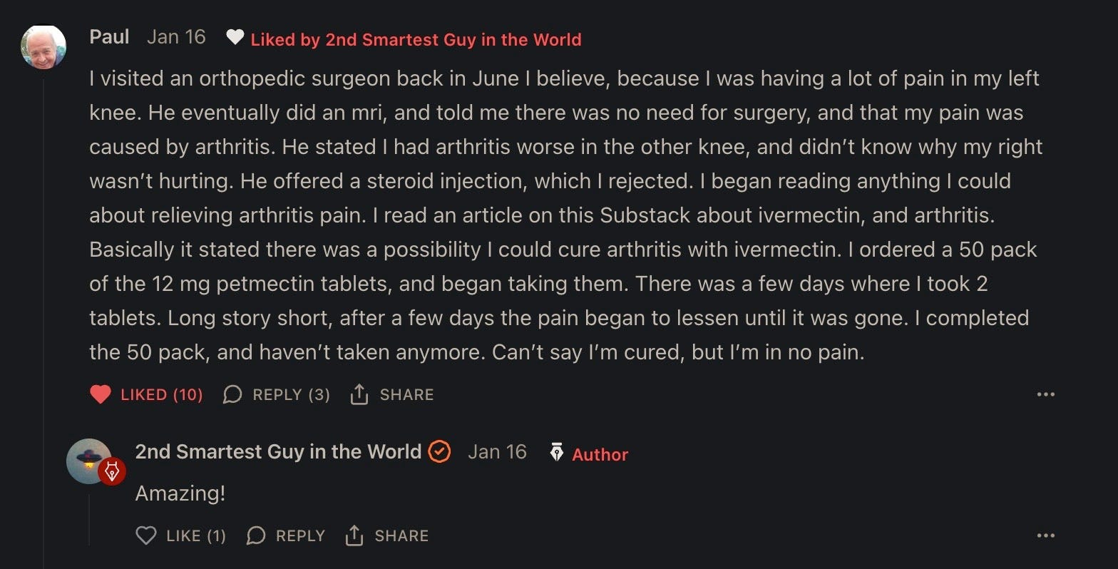 Readers of this Substack know that Ivermectin may treat arthritis and general inflammation, and today we have yet another encouraging experience: