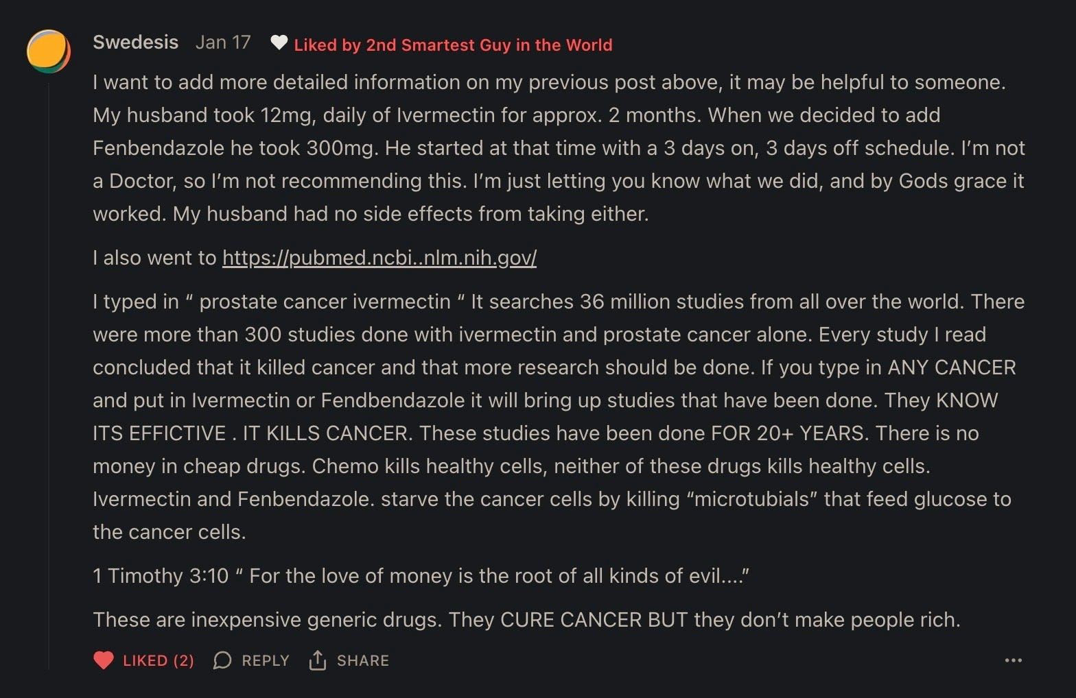 This subscriber has been using Ivermectin and Fenbendazole as a combination therapy for her husband’s stage 4 prostate cancer with incredible success: