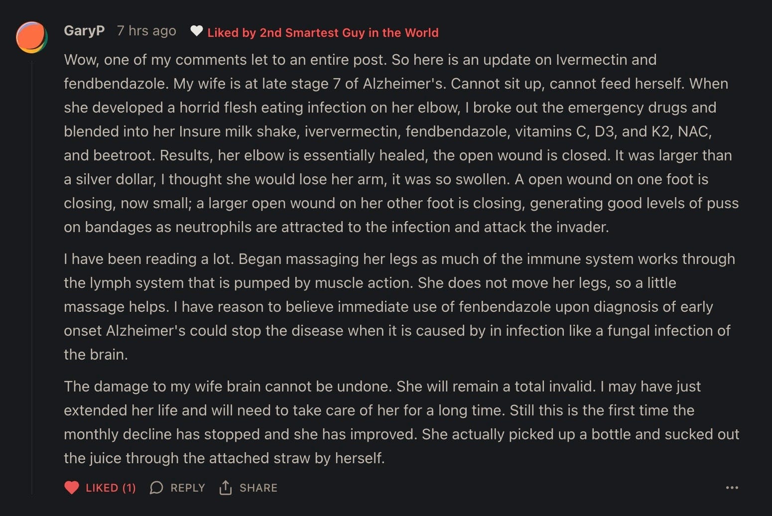 The first comment is an update that comes courtesy of a subscriber who had previously shared about the healing powers of Ivermectin and Fenbendazole: