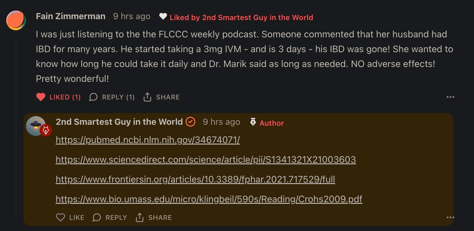 And our final comment is especially interesting given that this Substack has not focused on gastrointestinal conditions, which may be treatable with Ivermectin and Fenbendazole: