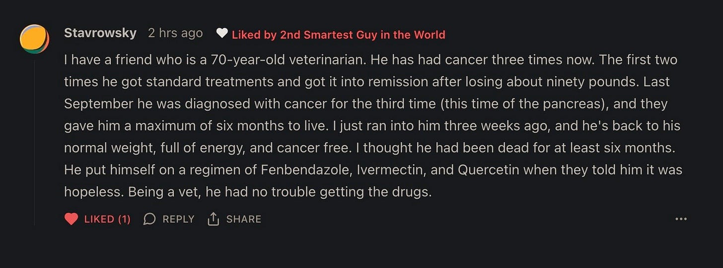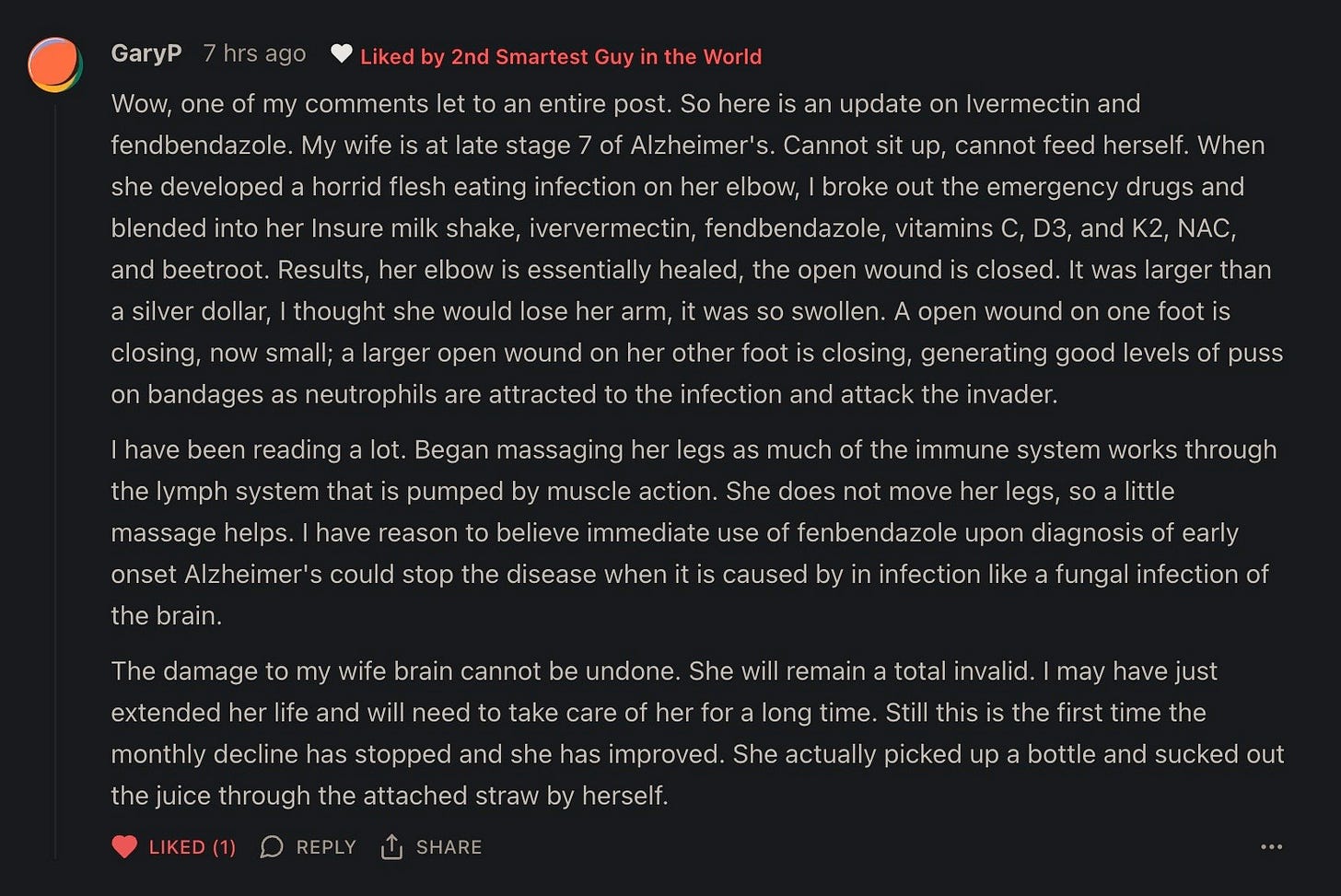 The first comment is an update that comes courtesy of a subscriber who had previously shared about the healing powers of Ivermectin and Fenbendazole: