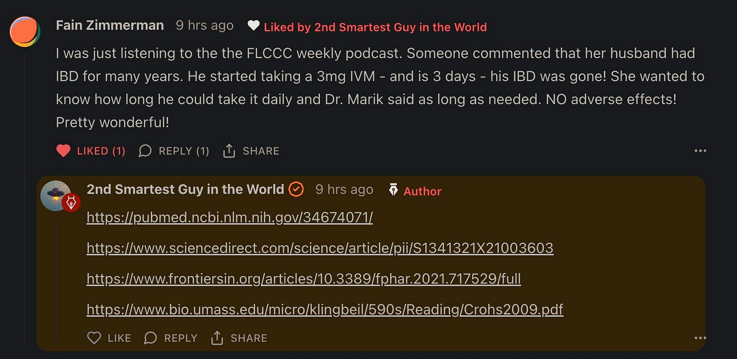 And our final comment is especially interesting given that this Substack has not previously focused on gastrointestinal conditions, which may also be treatable with Ivermectin and Fenbendazole:
