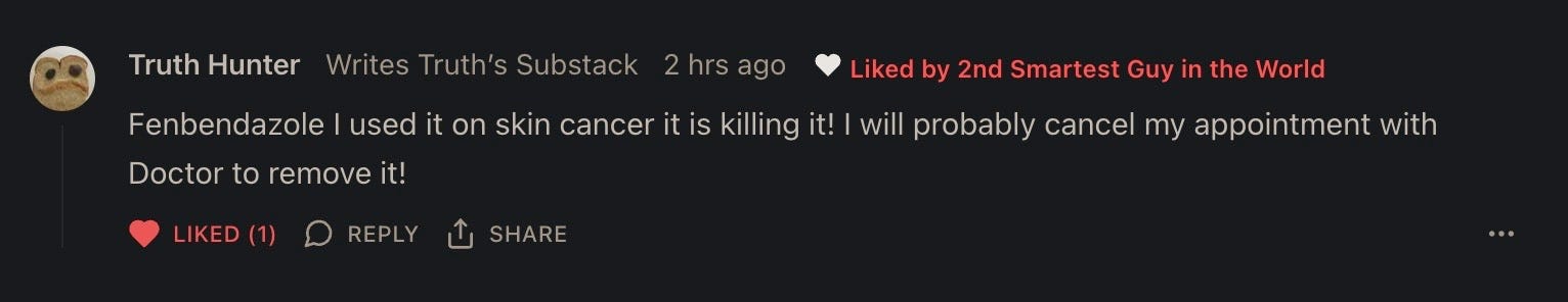 There is currently a dearth of research into topical Fenbendaloze application, yet this Substack’s subscriber correctly extrapolated on the efficacy of direct skin application: