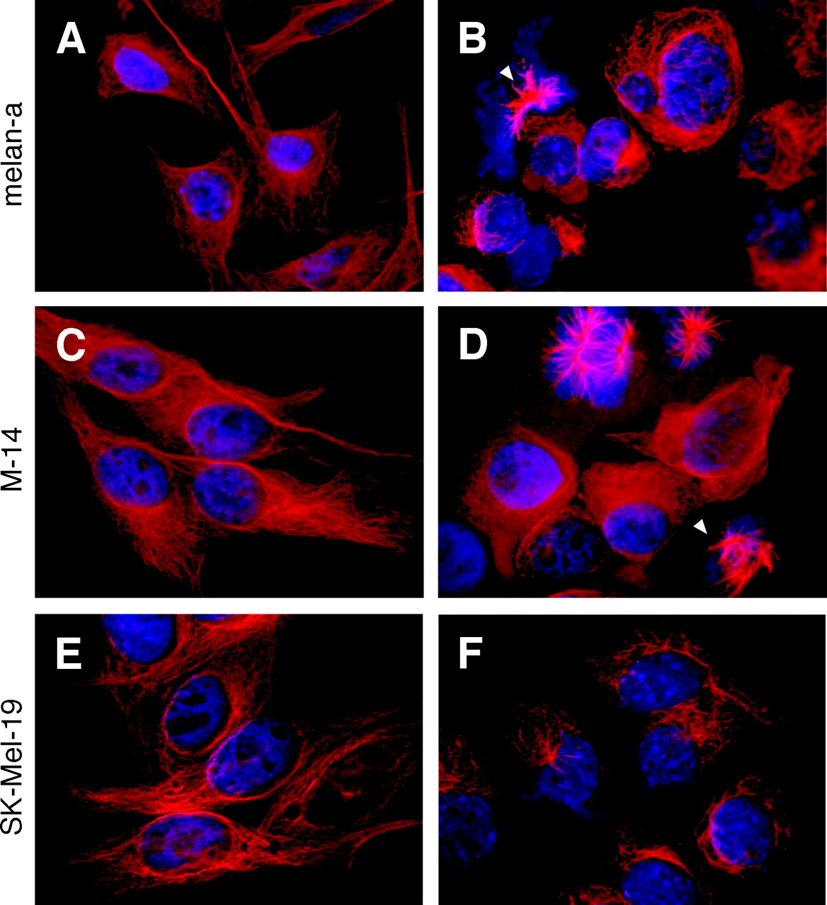 Mebendazole-induced microtubule disruption in melan-a, M-14, and SK-Mel-19 cells. Melan-a, M-14, and SK-Mel-19 cells were treated with vehicle alone (A, C, and E) or 0.5 μmol/L mebendazole for 14 h (B, D, and F). After permeabilization and fixation, cells were stained with anti-α-tubulin antibody (red) and 4′,6-diamidino-2-phenylindole (blue). Arrowheads, mitotic figures. Experiment was repeated thrice, with representative images shown.