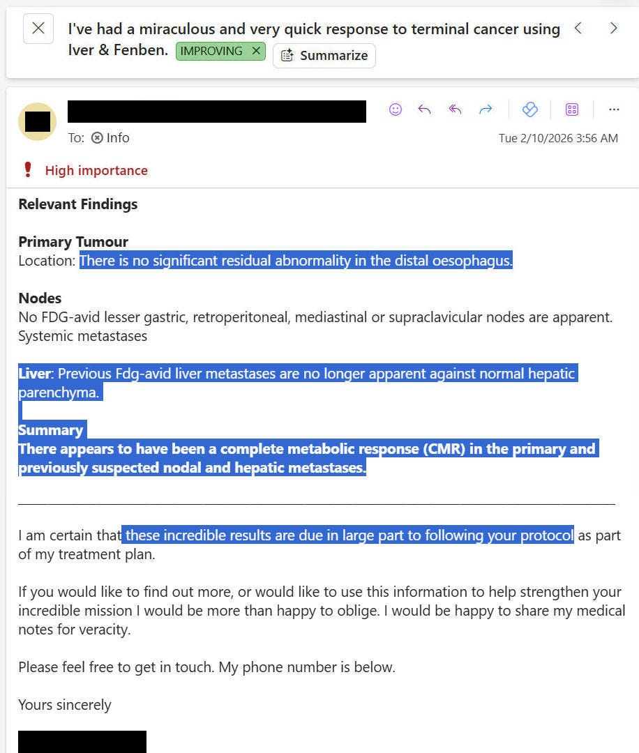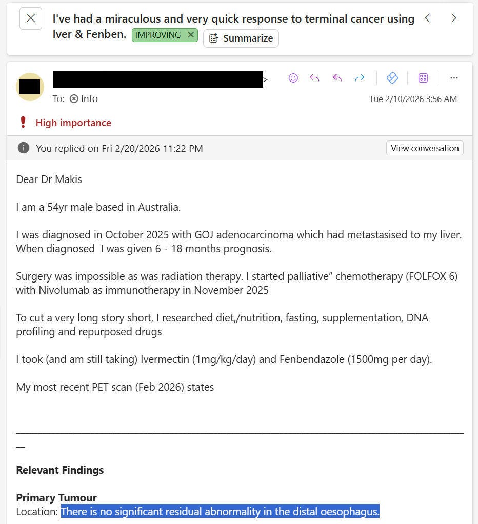 NEW ARTICLE: IVERMECTIN and FENBENDAZOLE Testimonial - 54 year old AUSTRALIAN man with Stage 4 Gastro-Esophageal Cancer reports after 3 months - from “6-18 months to live” to “Cancer Free”