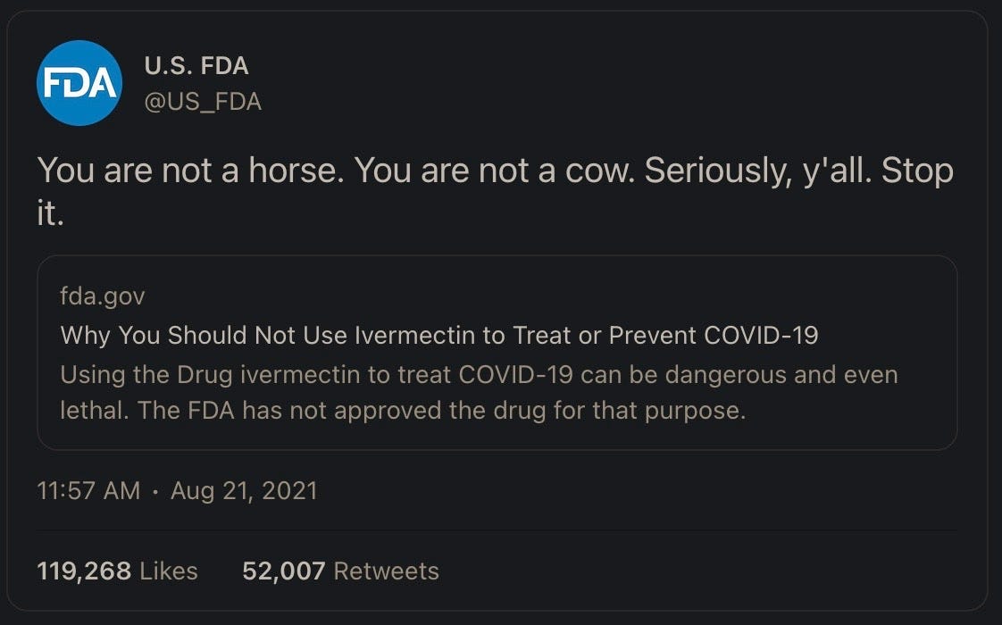The fact is that every drug has risks, including ivermectin, but over decades of global use and billions of doses prescribed, it’s proven itself to be an exceptionally safe drug, orders of magnitude safer than many prescription and over the counter drugs. Acetaminophen has held the top spot as the leading cause of calls to poison control centers, yet somehow it escaped a snarky tweet from FDA.