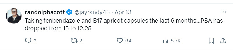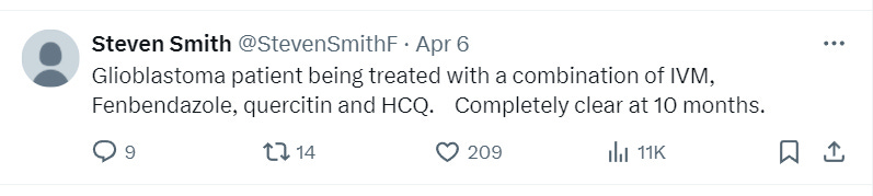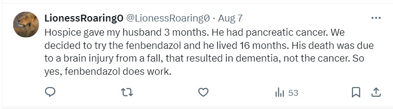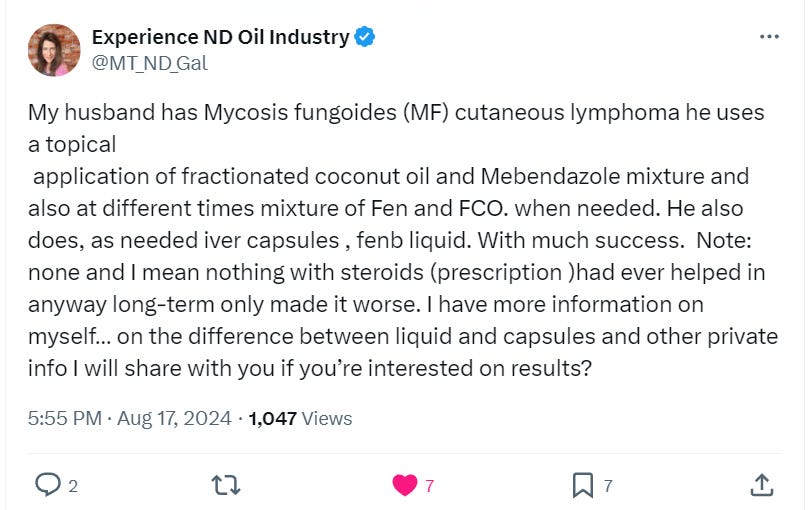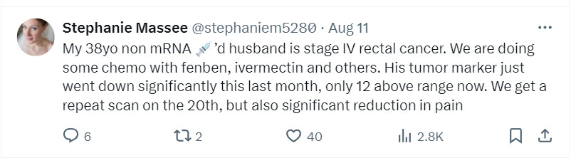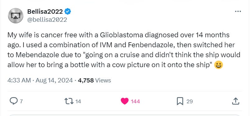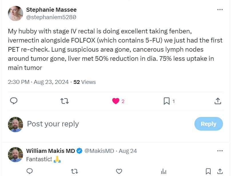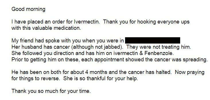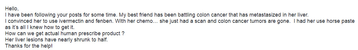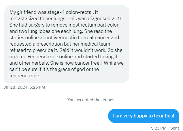 I started Cancer Consultations 3 weeks ago. The demand has not slowed down at all. These testimonials were sent to me before I started Cancer Consultations on Aug.1, 2024. Many people with advanced cancers are having excellent results with Ivermectin, Fenbendazole and Mebendazole. I hope to see hundreds, and then thousands of such testimonials in the months and years to come!