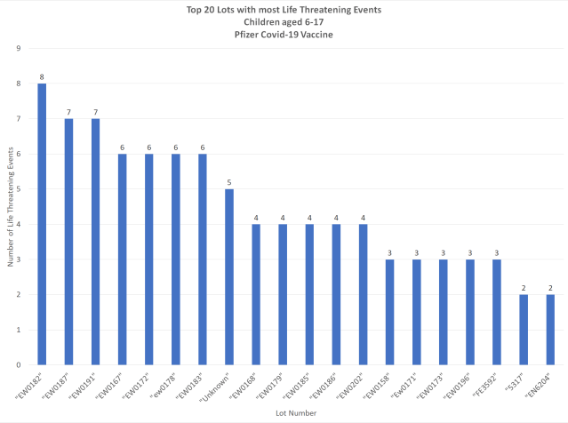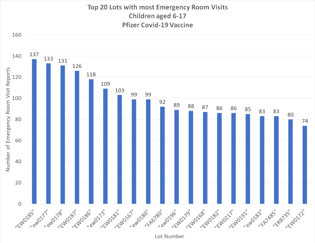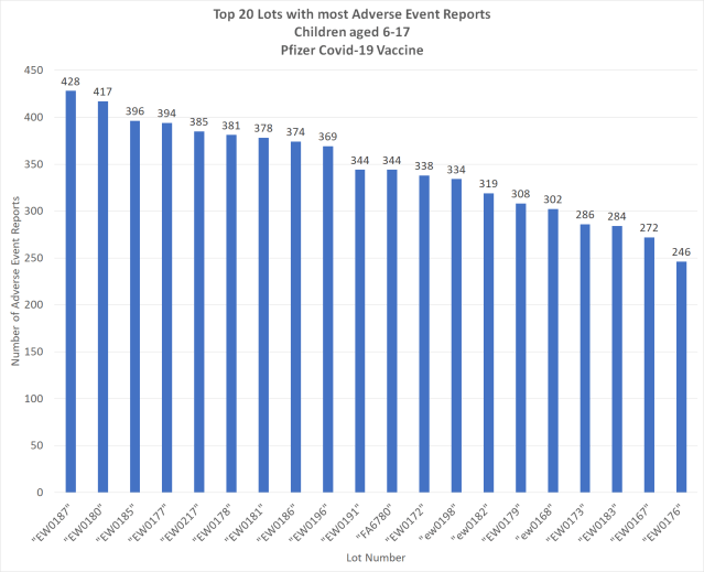 Why do the 20 most harmful batches of Pfizer vaccine from the 748 known batches administered to children all have lot numbers that closely correspond? Ranging from EW0162 to EW0217.