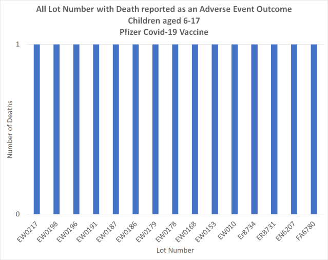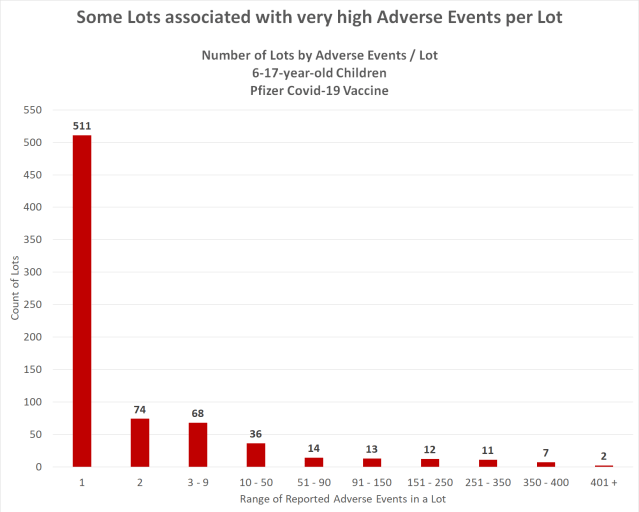 This suggests that there were a small quantity of dangerous batches of the Pfizer Covid-19 vaccine and a large quantity of seemingly harmless (at least in the short term) batches of the Pfizer Covid-19 vaccine administered to children.