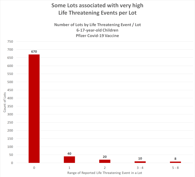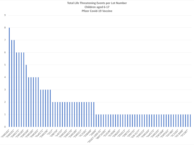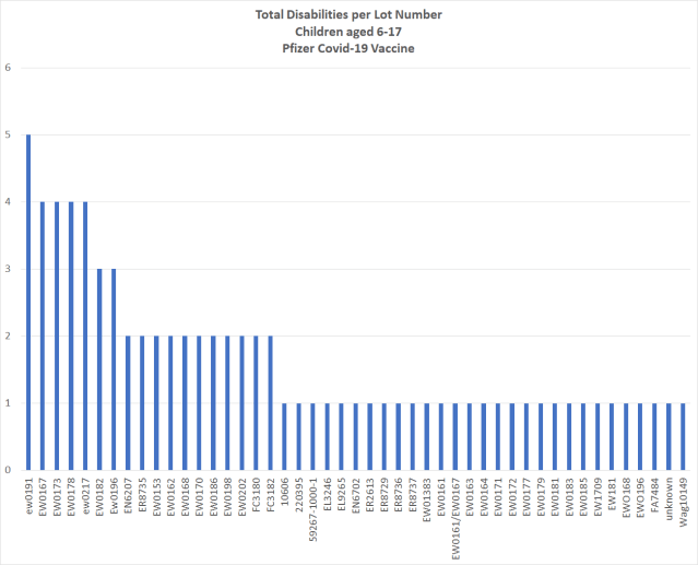 700 lots (94%) caused zero permanent disabilities among children, whilst 29 lots ( 4%) caused a single permanent disability among children. But 4 lots (0.5) caused 4 permanent disabilities per lot, equating to 33% (16/48) of all permanent disabilties reported as adverse reactions to the Pfizer jab among children.