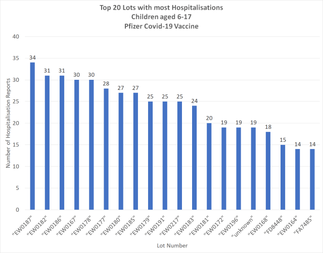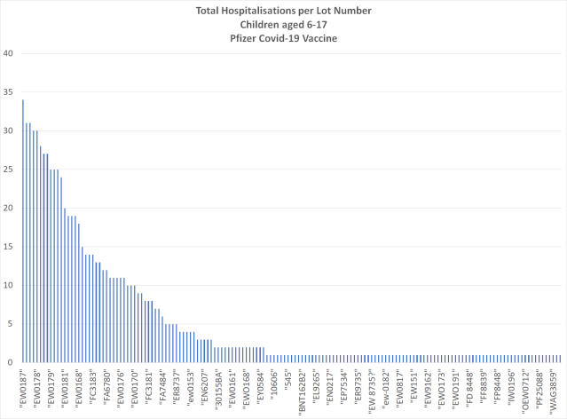 585 lots (78%) of the Pfizer jab caused zero hospitalisations among children, and 87 lots (12%) caused just 1 hospitalisation among children. But 5 lots of the Pfizer jab (0.7%) caused over 30 hospitalisations among children per lot.