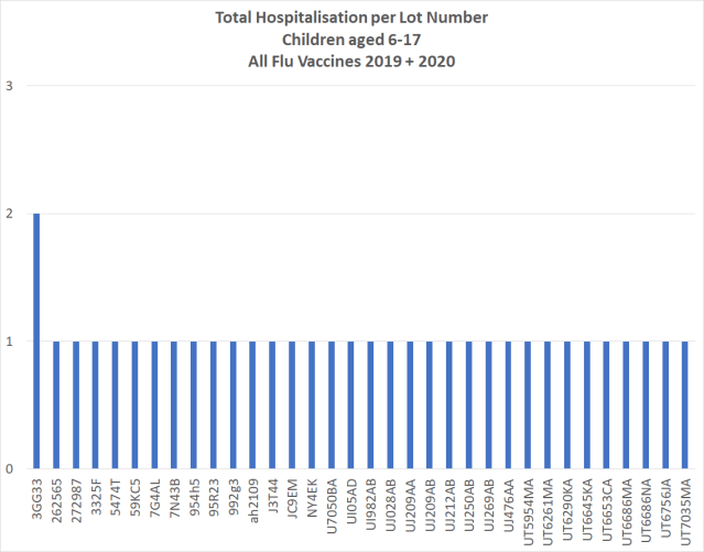 The above chart shows the number of hospitalisations reported as adverse reactions to the Pfizer vaccine by lot number sent across the USA. This chart has identified the actual lot numbers of influenza vaccine that caused children to be hospitalised.