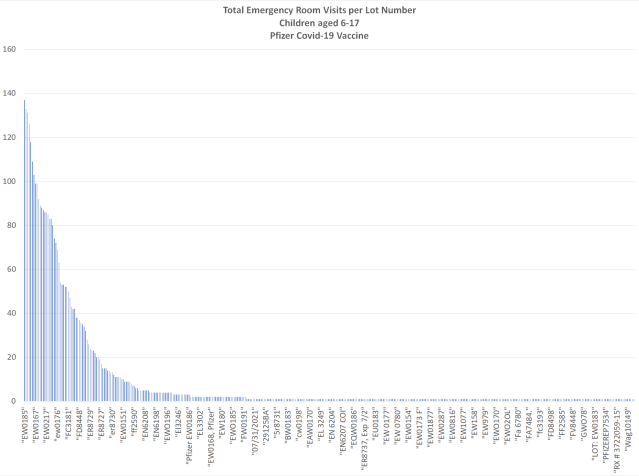 The above chart shows the number of adverse event reports made to VAERS against the Pfizer Covid-19 vaccine among children, sorted by the lot number of vaccine that was administered prior to the adverse event.