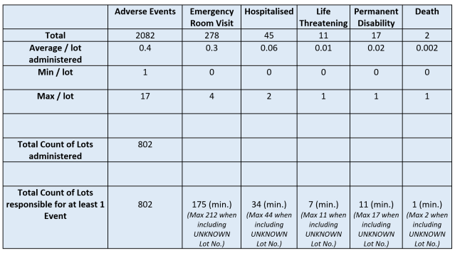 As you can see, just a single lot number ‘3GG33’ had more than 1 hospitalisation report against it but this only amounted to 2 hospitalisations. Whilst a further 33 lot numbers caused a single hospitalisation.