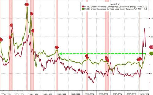 Goods inflation is slowing but services costs are soaring at their fastest since 1991...
