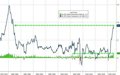 With The White House having desperately tried to front-run this morning's inflation print, analysts were expecting a jump higher led by food and energy costs. They were right in direction but it was way worse as the headline CPI soared 9.1% YoY (vs 8.8% exp and 8.6% prior)...
