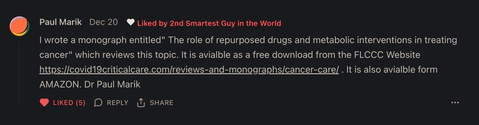 Our last comment comes courtesy of a doctor that I consider to be a certifiable hero, and someone that since the “pandemic” has been working tirelessly to help spread the word about lifesaving repurposed drugs.