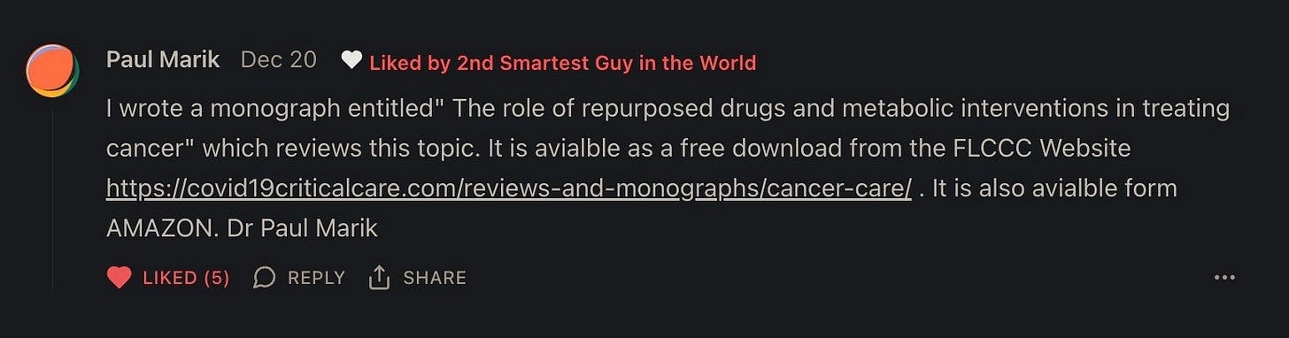 This Substack recently wrote about the powerful anticancer properties of Fenbendazole: I also mentioned in passing that one of reasons Ivermectin was so viciously maligned and suppressed was that if society were taking it to cure PSYOP-19 one of the side effects would be “sudden” plummeting cancer rates, and thus BigPharma et al. went all out to destroy …