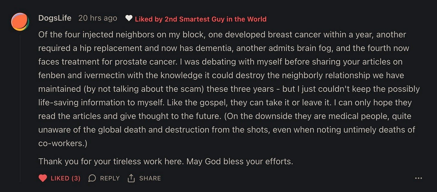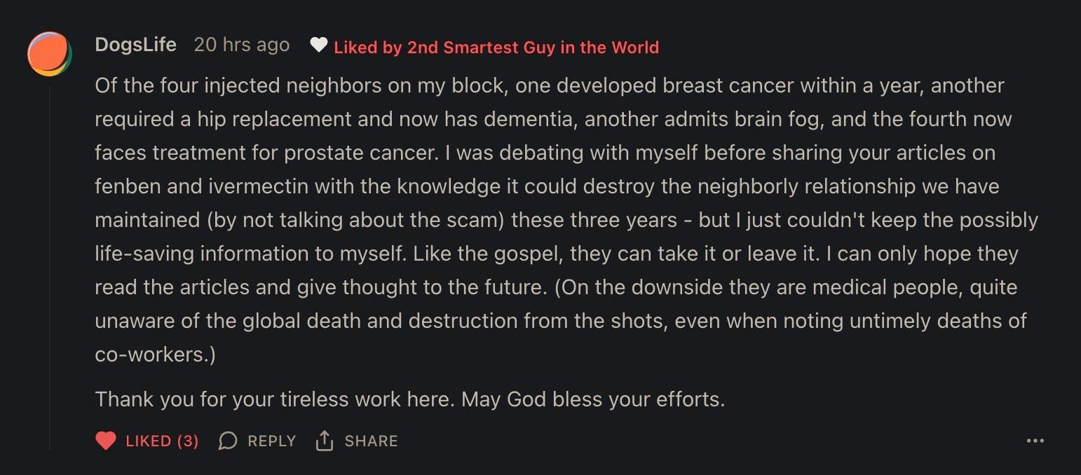 Our latest trio of subscriber comments starts with yet another horrifying corroboration of the slow kill bioweapon “vaccine” death and destruction:
