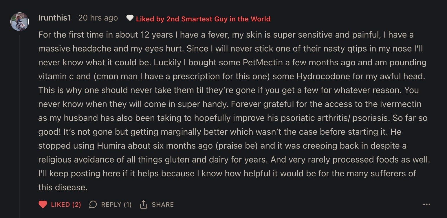 The next comment shows yet again that Ivermectin is effective for treating not just PSYOP-19, but, also, fevers, flus, and even the common cold: