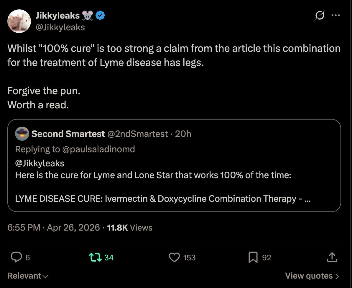 Our third article comes courtesy of Dr. Makis, who once again corroborates this Substack’s previous research, this time regarding Lyme Disease and its treatment using inexpensive repurposed drugs with my X post to him alerting to him to this: