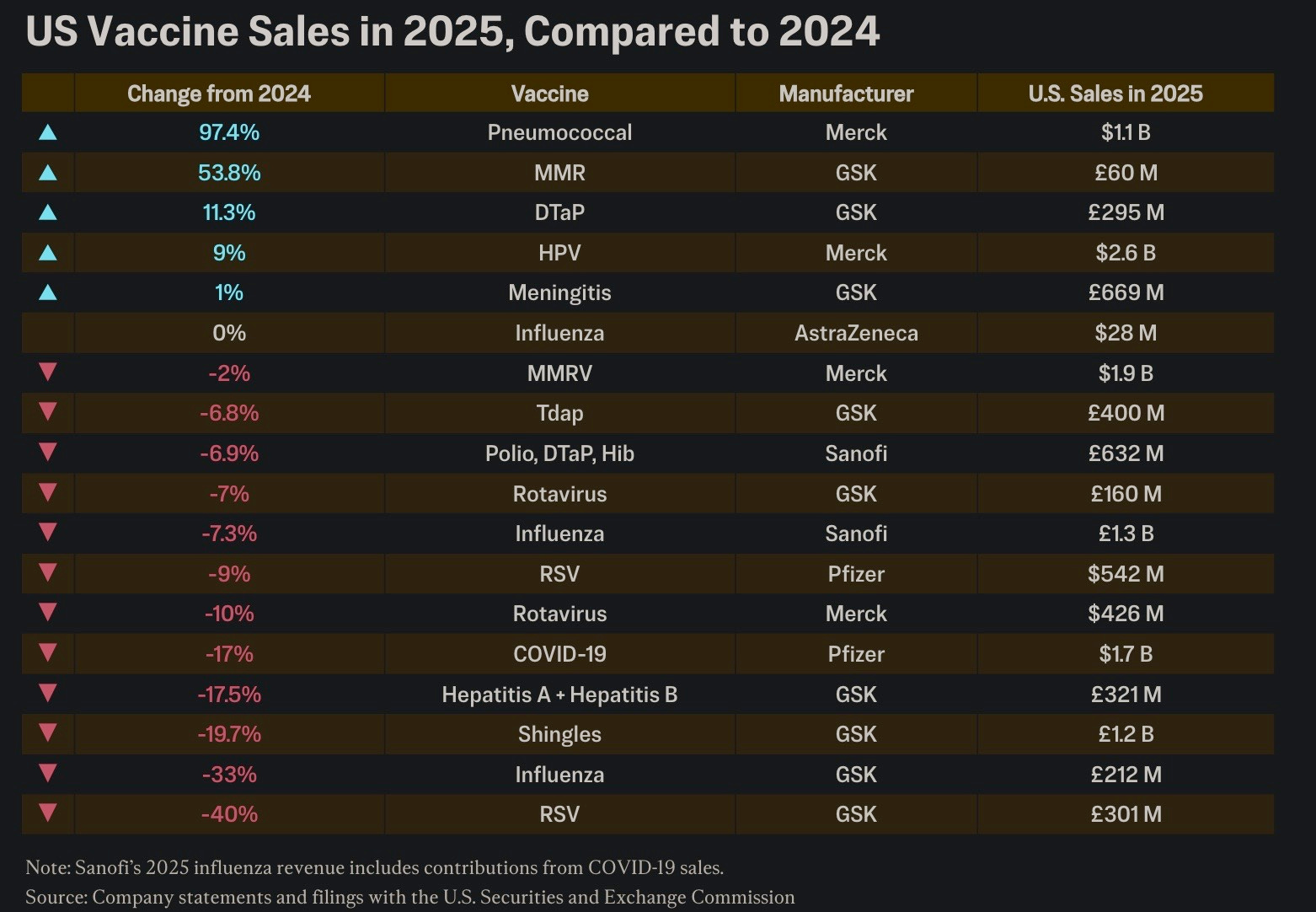 Sales for a handful of vaccines did increase in 2025, including sales for GlaxoSmithKline’s measles, mumps, rubella vaccine, and Merck’s shots against pneumococcal disease and human papillomavirus.