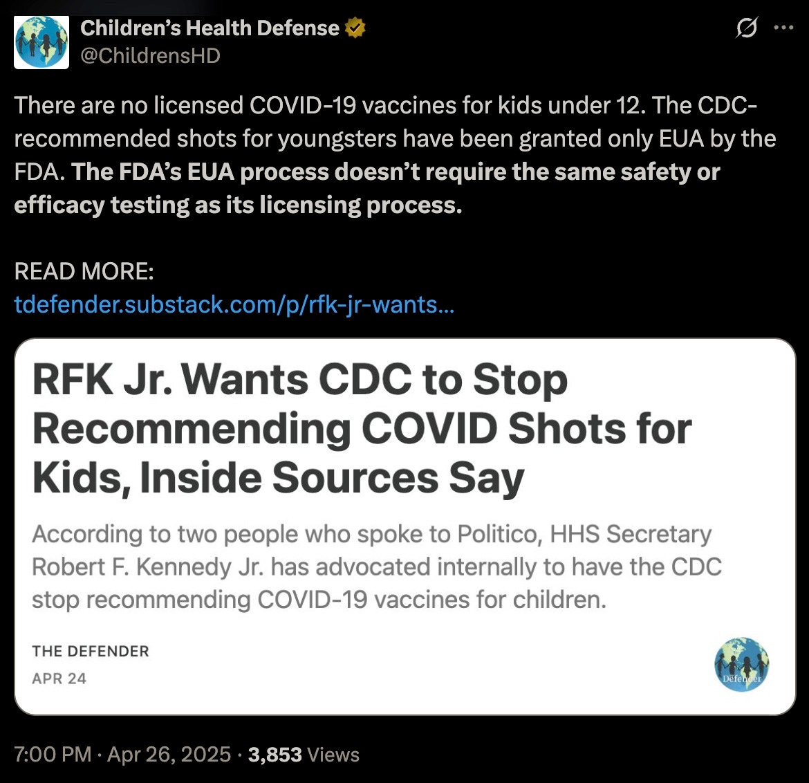 …and now he is finally setting his sights on the slow kill bioweapon “vaccines” as they pertain to children, who have a COVID-19 infection fatality rate (IFR) of around zero., and the “Emergency” Use Authorization (EUA) never applied to kids.