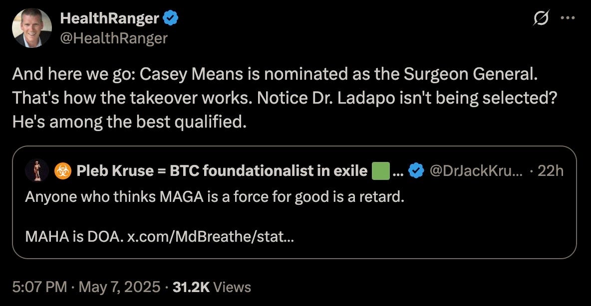 It appears that MAHA is now being fast-tracked for implosion from within, with Trump’s pick for Surgeon General being a carefully manufactured CIA whackjob installed to discredit and sow division within the burgeoning health movement.