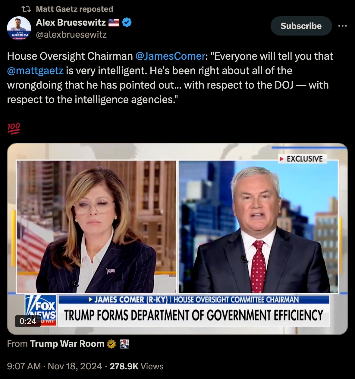 The real reason for that dirty “investigation” of Gaetz, despite his unassailable innocence, was due to the Intelligence Industrial Complex — the current 4th branch of government that rules the other three branches — being utterly terrified of him.