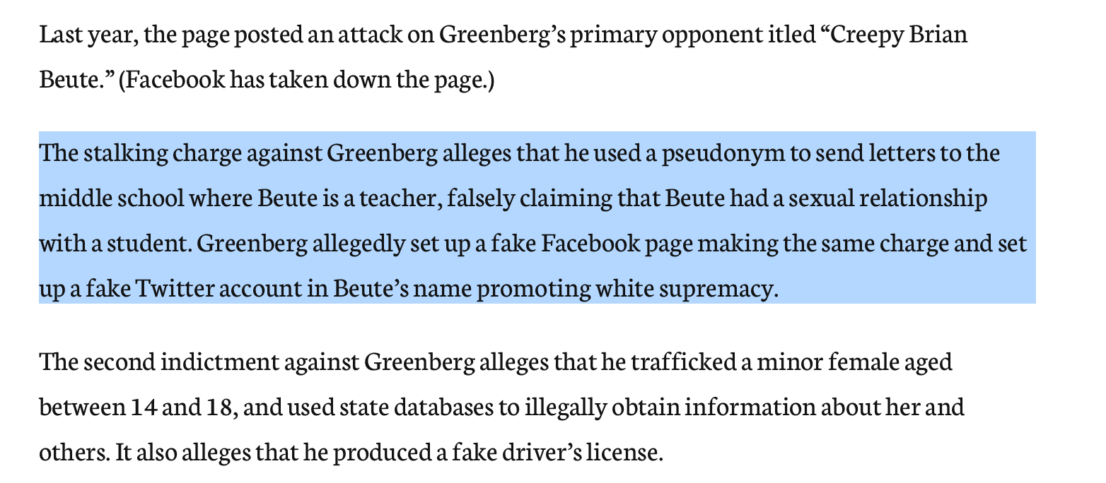So throughout late 2019 and into 2020 Greenberg rolled out a series of ever escalating smear tactics targeting Beute. They started rather typical, labeling Beute, who is from Michigan, as a carpetbagger.