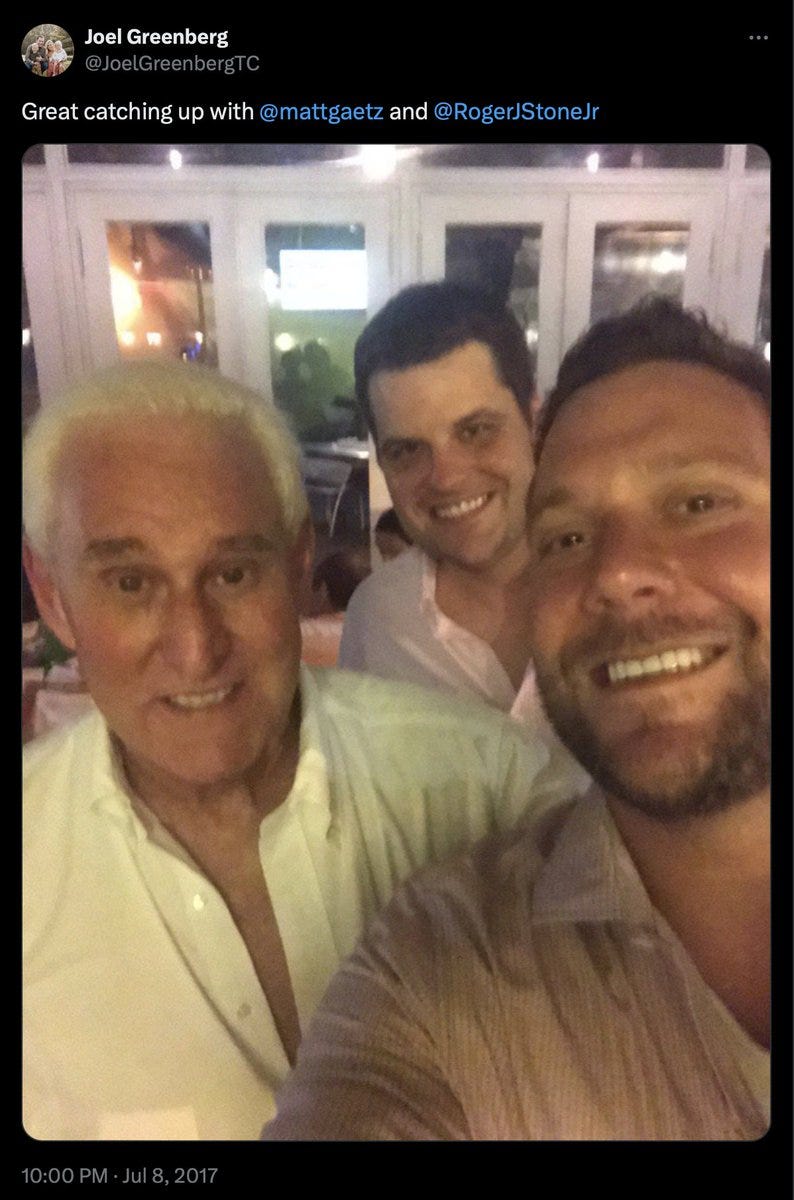 From what I can gather, Gaetz and Greenberg became acquainted at some point in the first half of 2017. The first public record of them associating on a private level comes from a picture posted to X (then Twitter) on July 8, 2017 with none other than Roger Stone.