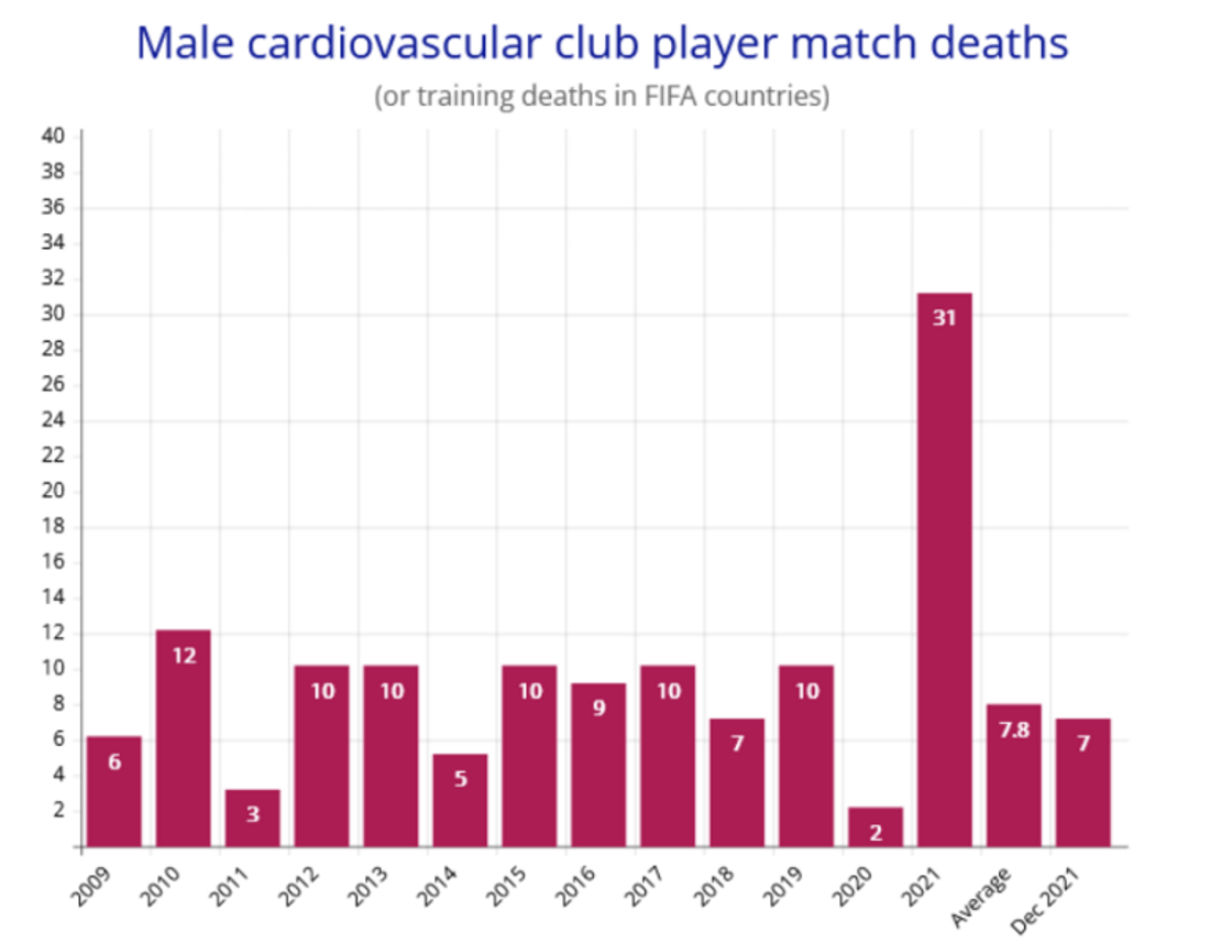 In all, deaths among professional football/soccer players in 2021 were 4 times the average rate recorded between 2009 and 2020.