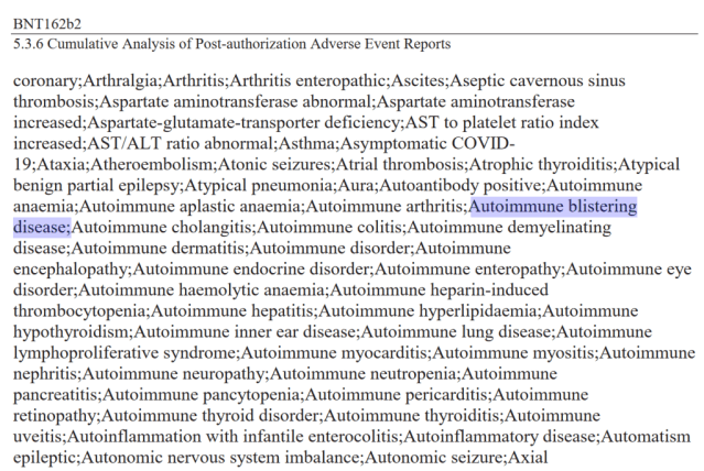 The condition is hidden within the 9-page long list of adverse events of special interest at the end of Pfizer’s reissue_5.3.6 postmarketing experience.pdf document.