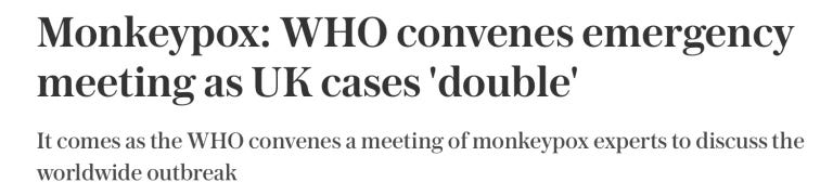 Monkeypox was first identified in 1958, but there’s never been a global Monkeypox outbreak outside of Africa until now—in the exact week of the exact month predicted by the biosecurity folks in their pandemic simulation. Take these guys to Vegas!