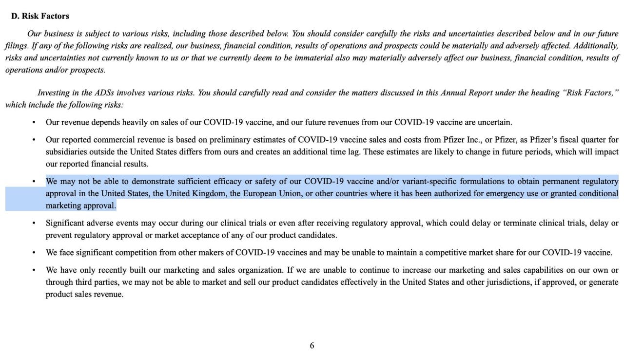 NEW - BioNTech says in its annual report to the US Securities and Exchange Commission that the efficacy of its current mRNA Corona vaccine may not be sufficient for permanent regulatory approval.