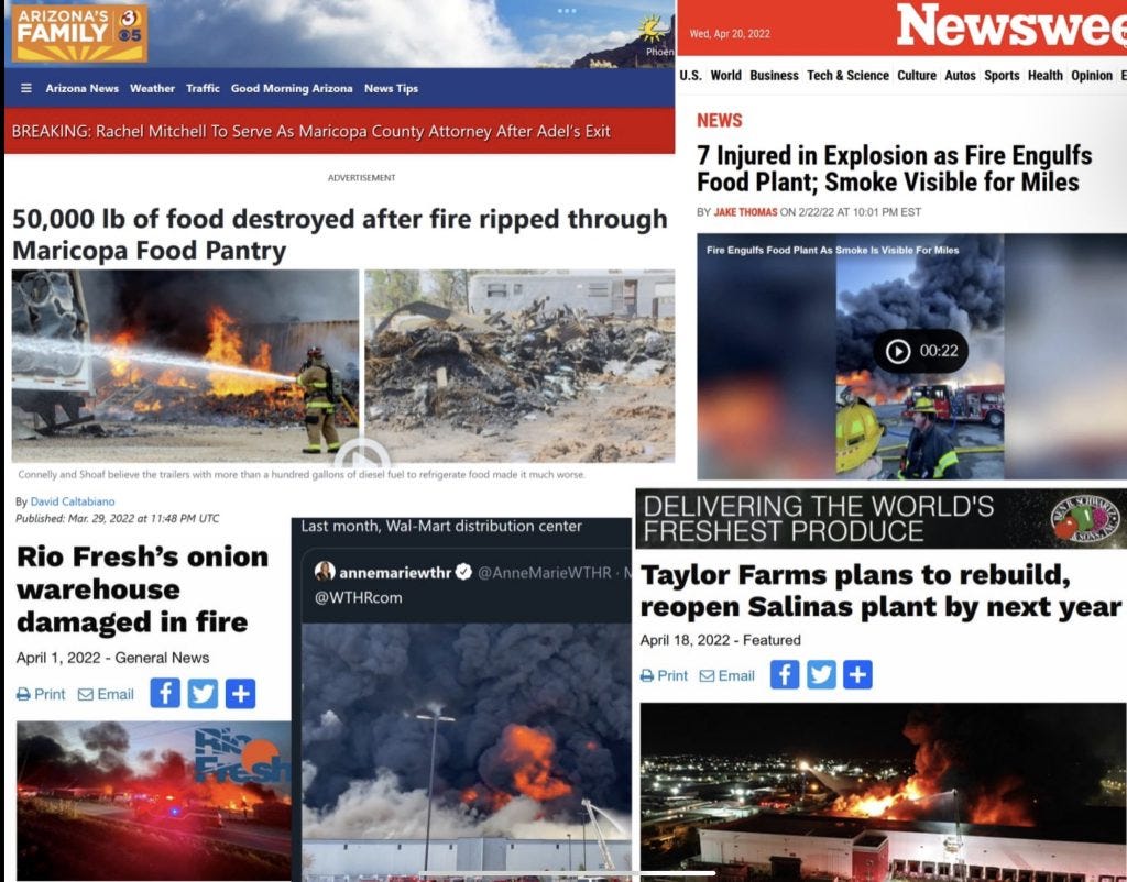 Since the start of 2022, over a dozen major food processing and fertilizer plants have gone up in flames, exploded, or been struck by a plane crash in Arizona, Arkansas, California, Illinois, Indiana, Kansas, Louisiana, Maine, New Hampshire, North Carolina, Oregon, Texas, Washington, and Wisconsin. Nothing odd about this at all. Some articles on these fires can be found here, here, and here.