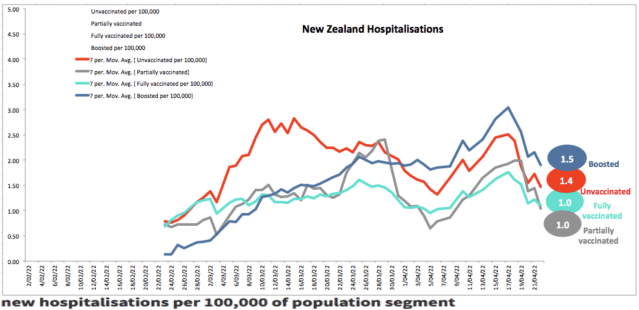 The actual NZ situation is quite different, the unvaccinated are currently less likely to be hospitalised than the boosted. Thank you to Grant Dixon for compiling and graphing NZ Ministry of Health data, below.
