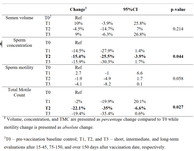 The above chart shows that “total motile count” – the number of sperm in the ejaculated semen – plunged 22%, three to five months after the second shot (T2) and barely recovered during the final count (T3) when it was still 19 per cent below the pre-shot level.
