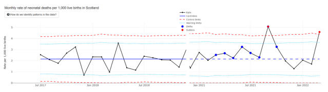 The same Public Health Scotland ‘Covid-19 Wider Impacts’ dashboard also reveals that the rate of neonatal deaths increased to 4.6 per 1000 live births in March 2022, a 119% increase on the expected rate of deaths. This means the neonatal mortality rate breached an upper warning threshold known as the ‘control limit’ for the second time in the last 7 months.