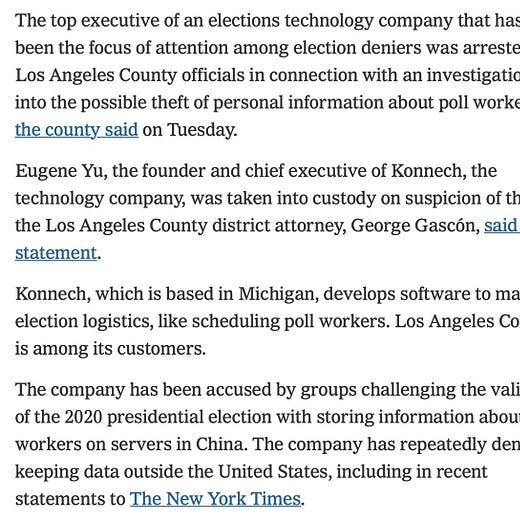 But the attacks on Konnech demonstrate how far-right election deniers are also giving more attention to new and more secondary companies and groups. Their claims often find a receptive online audience, which then uses the assertions to raise doubts about the integrity of American elections."