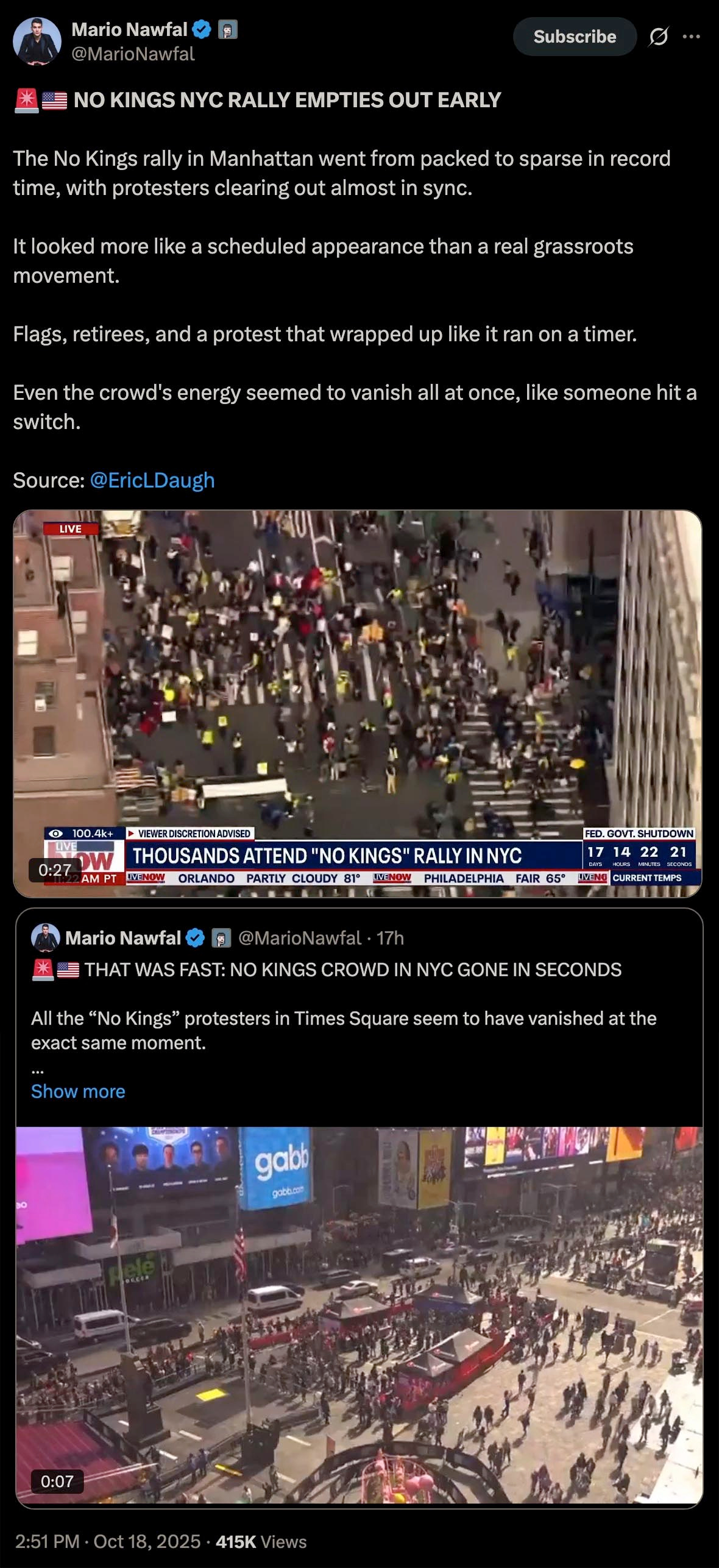 …with President Trump having just posted on his Truth Social an AI created clip of himself with a golden crown flying a fighter jet that is dropping mud bombs all over leftist influencer Harry Sisson and his fellow brainwashed protestors in Times Square, NYC: