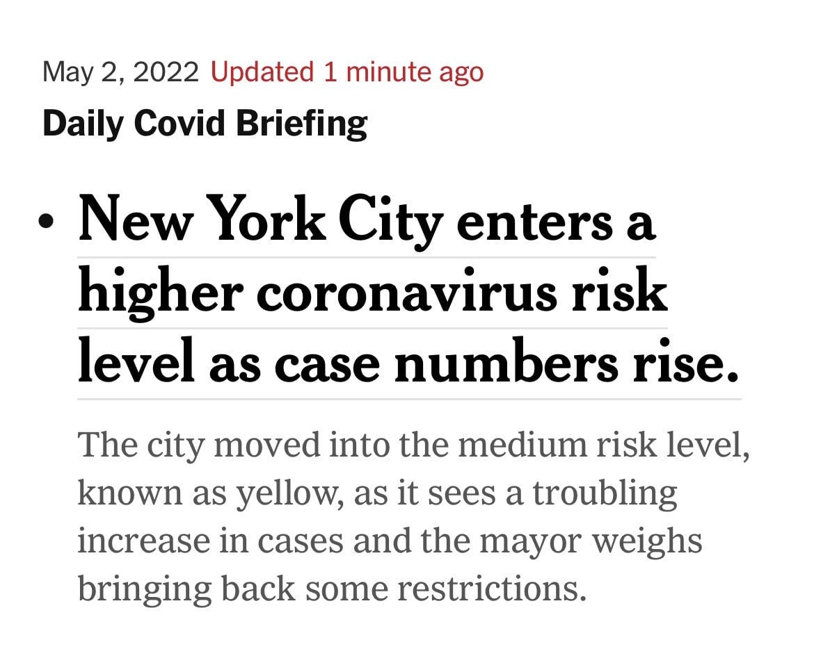 Normalizing the Upcoming PSYOP-22: JUST IN - NYC raises "COVID alert level" from "low" to "medium".